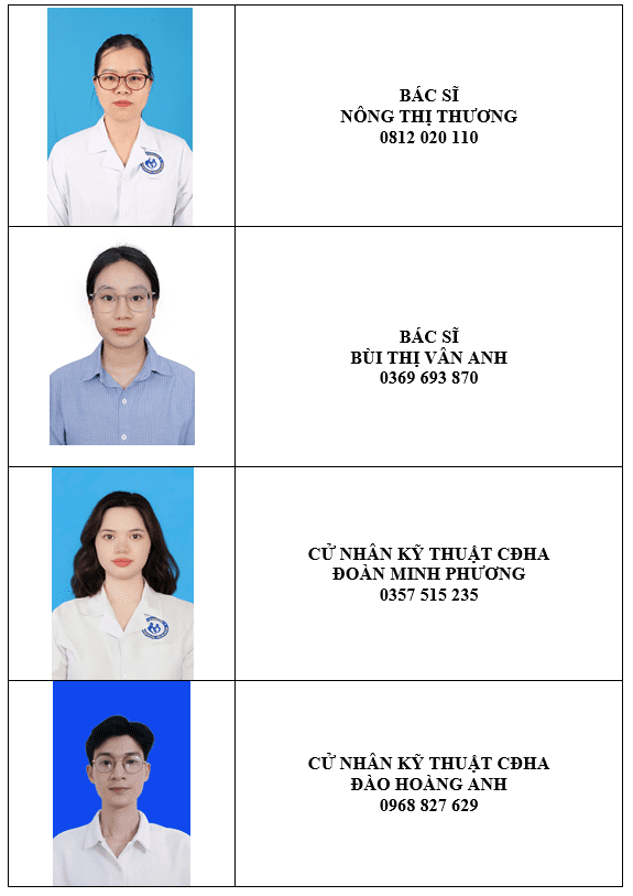 - Trình độ chuyên môn: 02 Bác sĩ CKI; 02 Bác sĩ đa khoa; 03 Cử nhân Kỹ thuật hình ảnh y học; 02 Cao đẳng Kỹ thuật hình ảnh y học và 01 Cử nhân điều dưỡng.