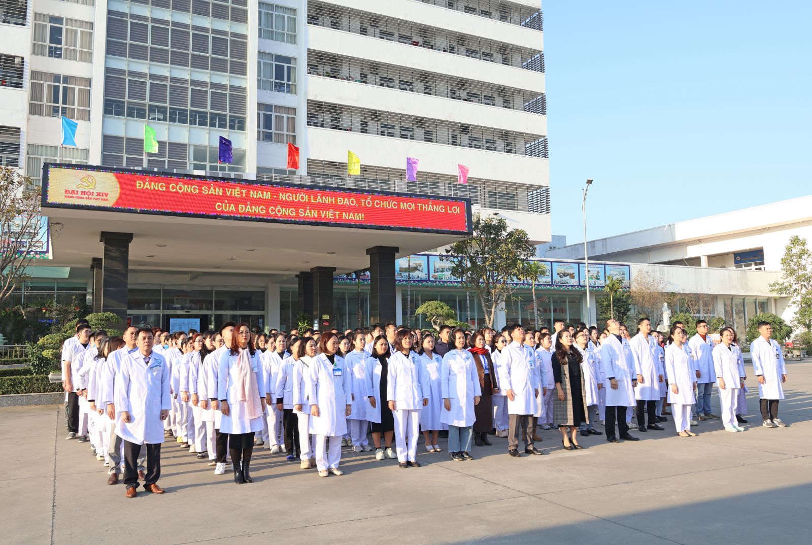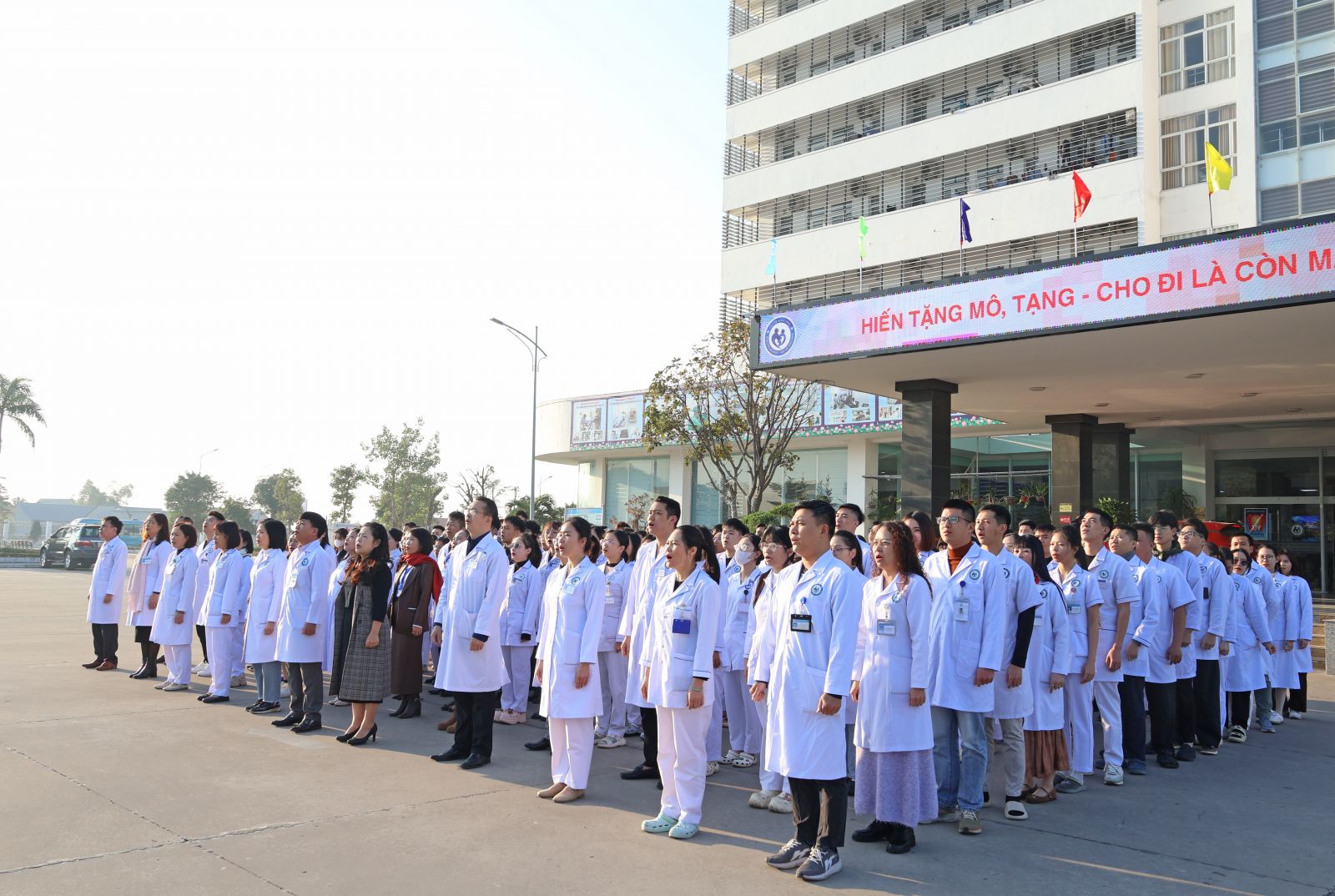 Dưới cờ đỏ sao vàng, toàn thể cán bộ, viên chức, người lao động bệnh viện đứng nghiêm, hướng về lá cờ Tổ quốc và đồng thanh cất cao tiếng hát Quốc ca. Giai điệu hào hùng, thiêng liêng vang lên mạnh mẽ, lan tỏa trong không gian bệnh viện, tạo nên khoảnh khắc xúc động và đầy ý nghĩa. Mỗi câu hát không chỉ thể hiện lòng yêu nước, niềm tự hào dân tộc, mà còn là sự khẳng định về ý chí thống nhất, tinh thần đoàn kết và trách nhiệm phụng sự của tập thể những người làm công tác bảo vệ, chăm sóc và nâng cao sức khỏe Nhân dân.