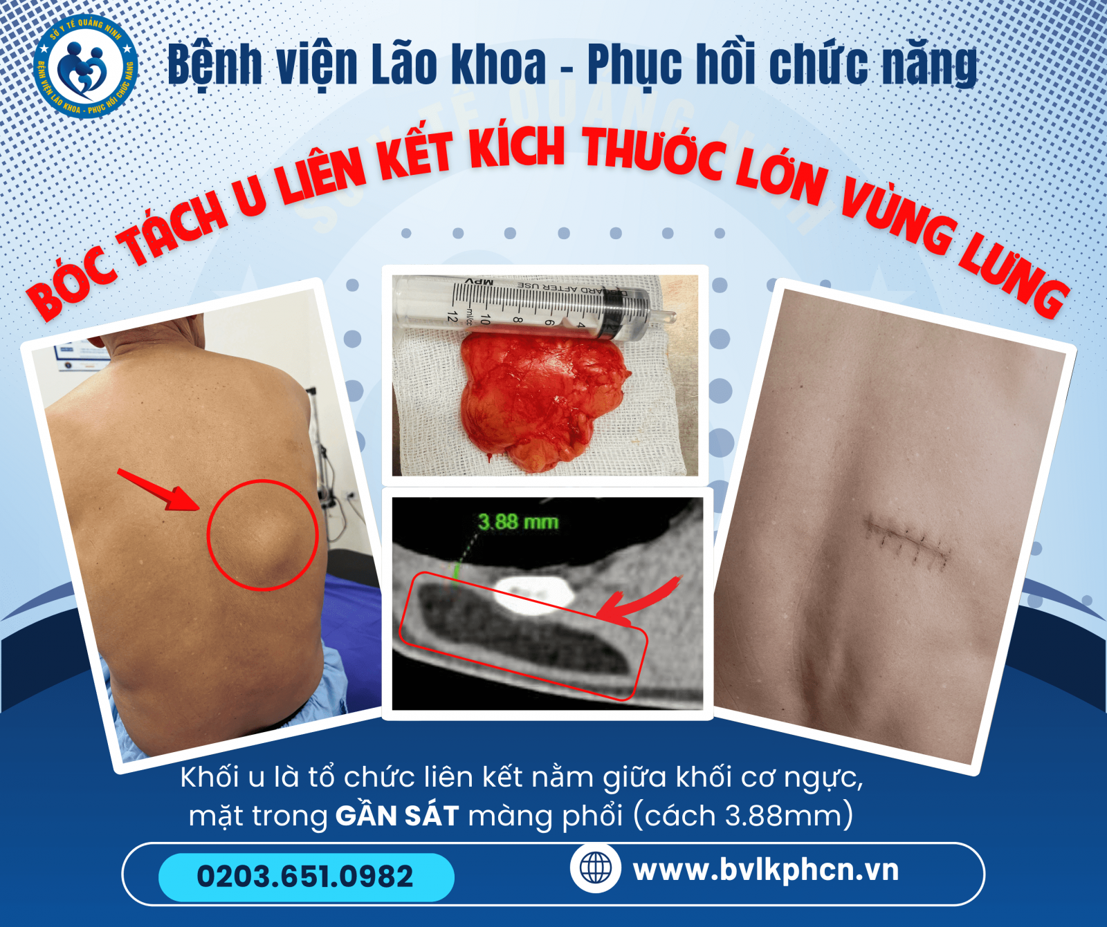 Bệnh nhân nam, nhập viện với khối u nhô cao vùng lưng, phát triển trong nhiều năm, không đau nhưng gây khó chịu khi nằm và ảnh hưởng thẩm mỹ.