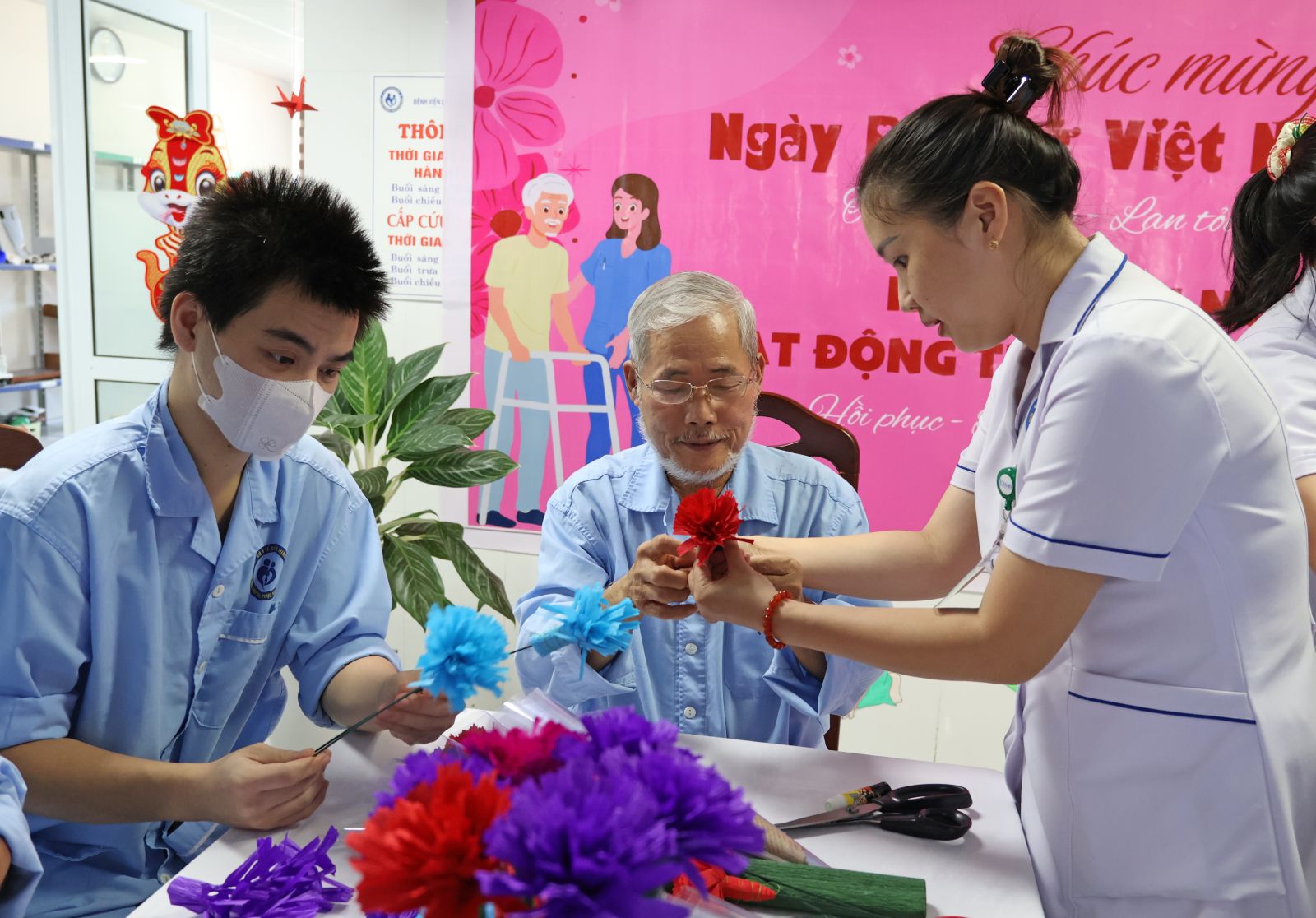 Điểm nhấn của chương trình là hoạt động sáng tạo kết hợp Hoạt động trị liệu đặc biệt, khi các bệnh nhân nam cùng nhau làm thiệp chúc mừng và hoa giấy thủ công gửi tặng người bệnh nữ trong khoa. Những món quà giản dị nhưng chứa đựng tình cảm chân thành, sự sẻ chia và niềm trân quý, giúp người bệnh cảm nhận được giá trị bản thân và tình người trong môi trường điều trị. Nhiều người bệnh xúc động chia sẻ rằng đây là một buổi sinh hoạt đầy ý nghĩa, vừa mang tính trị liệu, vừa là nguồn động viên tinh thần to lớn, giúp họ thêm vững tin trên hành trình phục hồi chức năng.