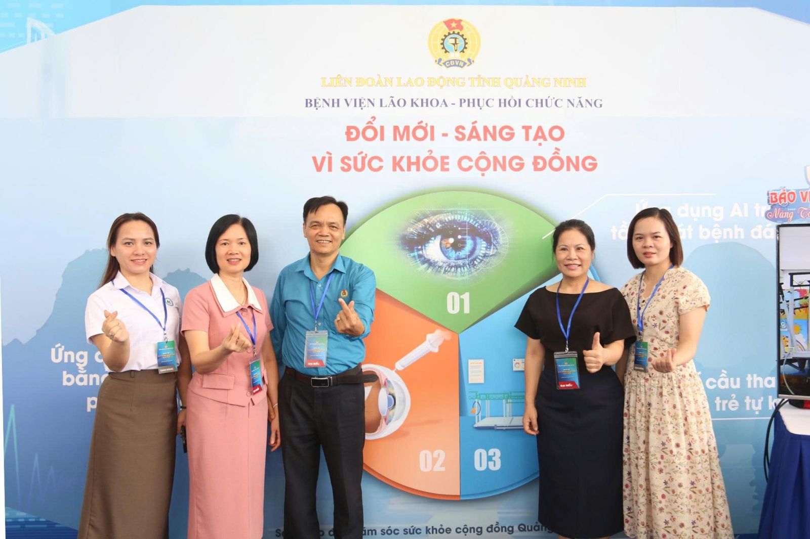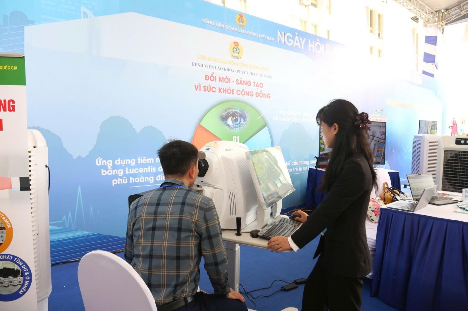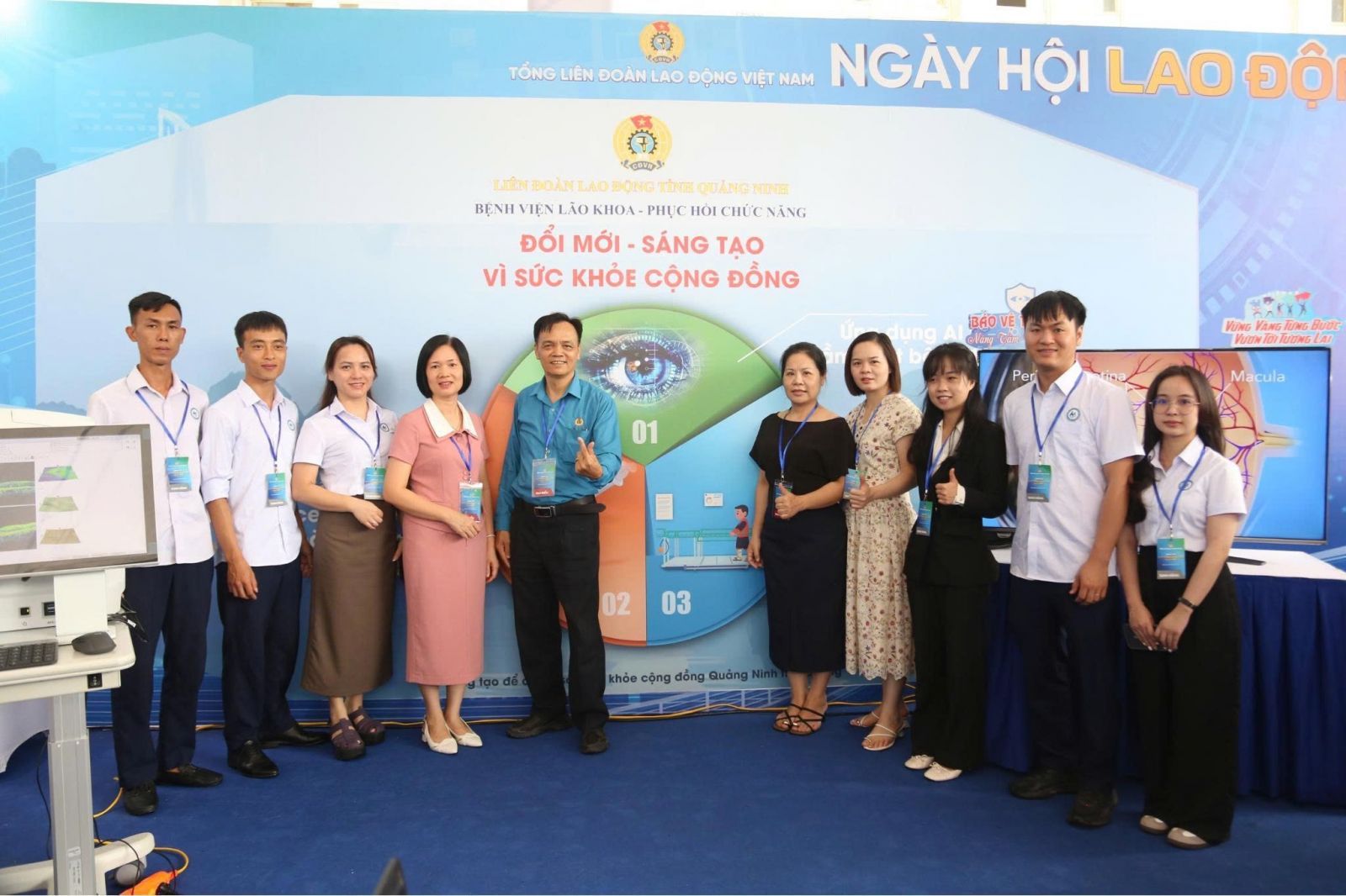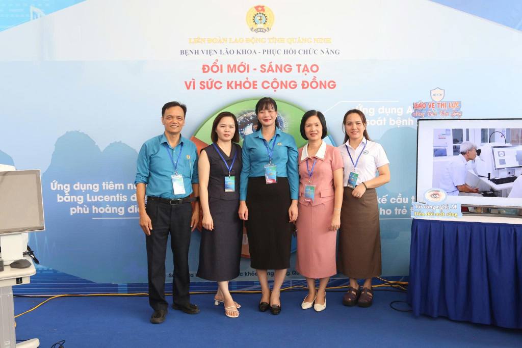 Bệnh viện Lão khoa - Phục hồi chức năng Quảng Ninh vinh dự được Liên đoàn Lao động tỉnh Quảng Ninh lựa chọn đại diện tham dự sự kiện, với 03 sáng kiến, sản phẩm tiêu biểu được trưng bày, giới thiệu tại “Ngày hội Lao động sáng tạo năm 2025: 02 Đề tài "Nghiên cứu ứng dụng liệu pháp ức chế tăng sinh tân mạch với kỹ thuật tiêm nội nhãn bằng thuốc Ranibizumab (Lucentis) trong điều trị phù hoàng điểm do đái tháo đường tại Bệnh viện Lão khoa - Phục hồi chức năng" và "Ứng dụng trí tuệ nhân tạo (AI) hỗ trợ phân tích ảnh học trong tầm soát các bệnh lý võng mạc tại tỉnh Quảng Ninh" do BSCKII Trình Thị Vân Anh - Phó giám đốc, Chủ tịch công đoàn Bệnh viện Lão khoa - Phục hồi chức năng làm chủ nhiệm và sáng kiến “Cầu thang xương cá tập đứng, đi cho trẻ khó khăn về vận động” do Ths.BS Lê Thu Huyền - Phó Giám đốc Bệnh viện Lão khoa - Phục hồi chức năng làm chủ nhiệm.