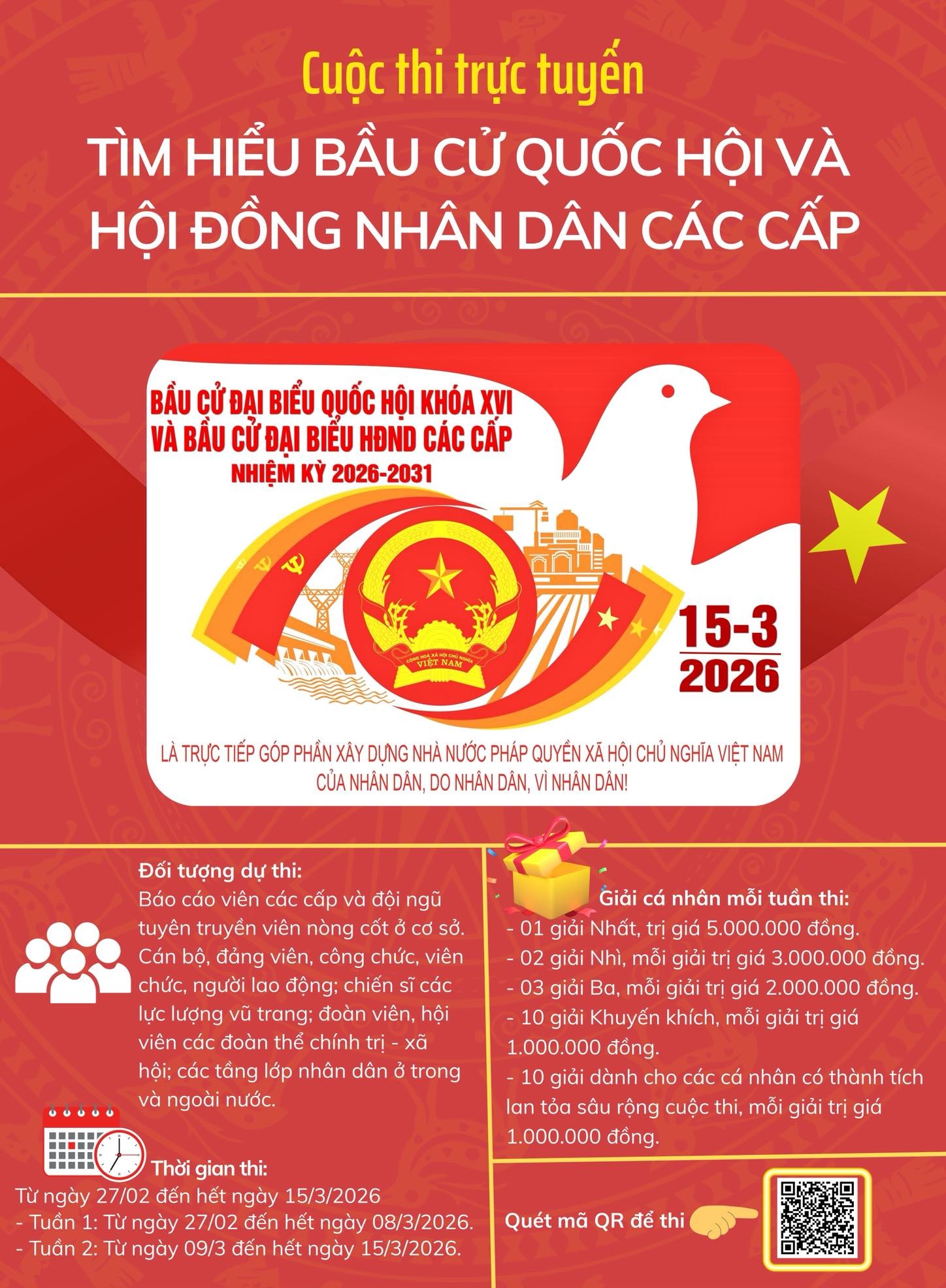 Nhằm góp phần tuyên truyền sâu rộng, tạo sự thống nhất cao về nhận thức, tư tưởng chính trị và hành động trong Đảng, sự đồng thuận trong xã hội để tổ chức thành công cuộc bầu cử đại biểu Quốc hội khóa XVI và đại biểu Hội đồng nhân dân các cấp nhiệm kỳ 2026 - 2031, Ban Tuyên giáo và Dân vận Trung ương phối hợp với Đảng ủy Quốc hội tổ chức Cuộc thi trực tuyến tìm hiểu bầu cử Quốc hội và Hội đồng nhân dân các cấp trên Trang Thông tin điện tử tổng hợp Báo cáo viên (baocaovien.vn) như sau: