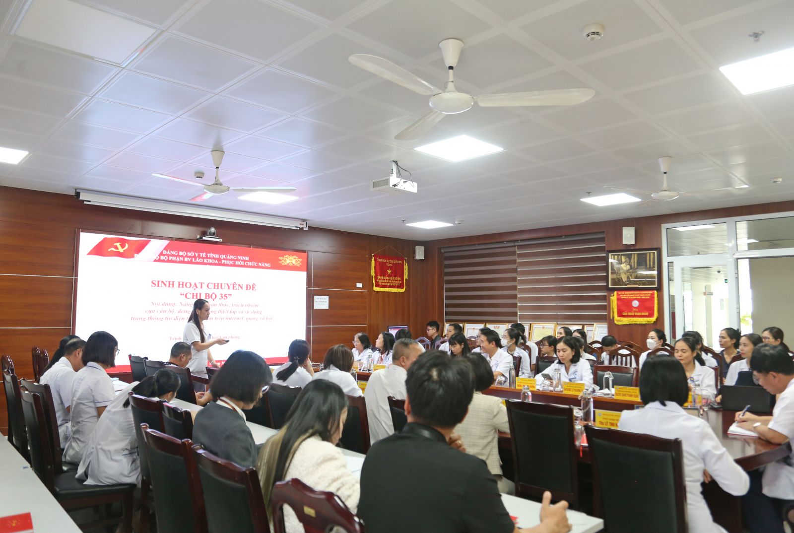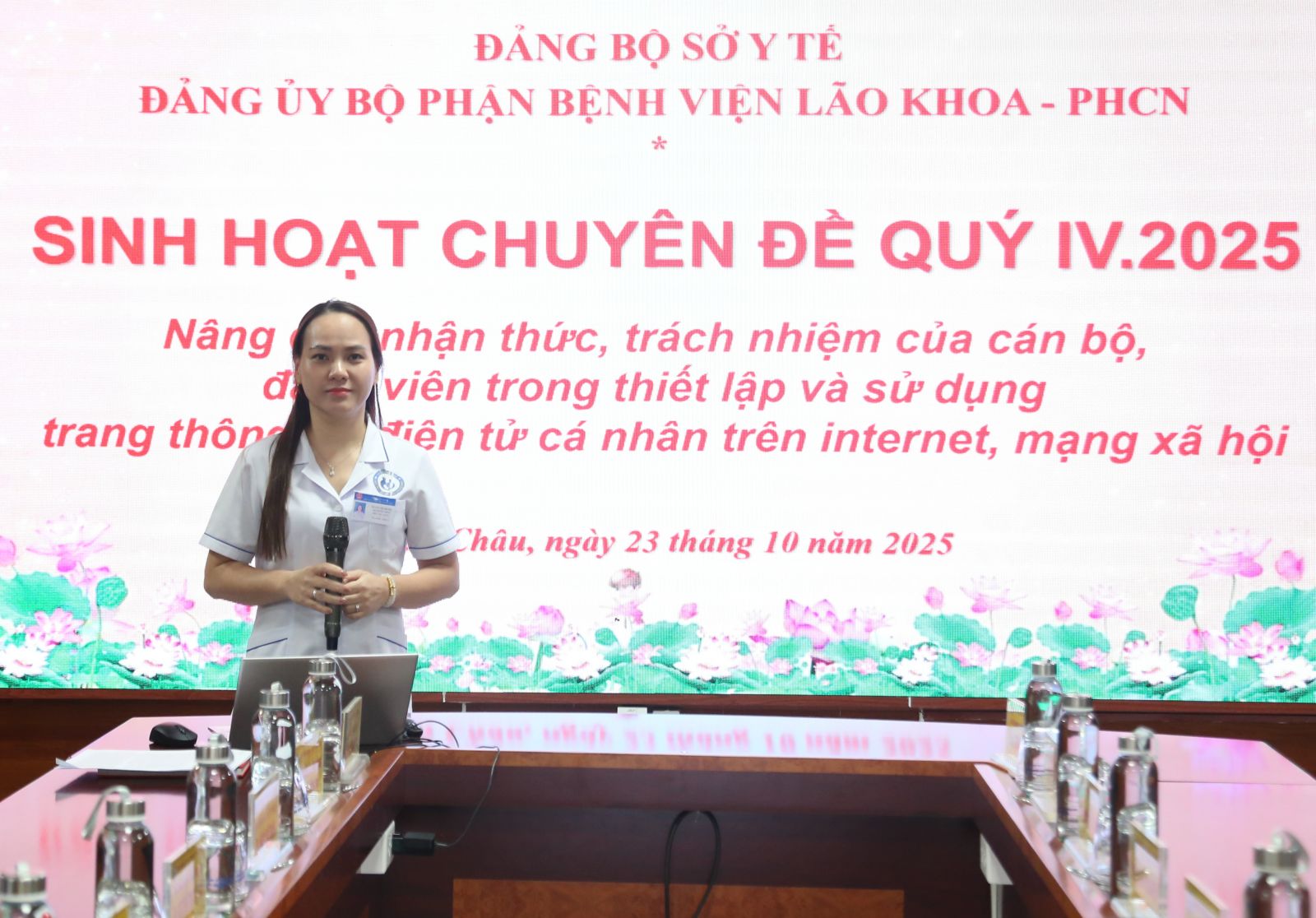 Thực hiện sự chỉ đạo của Đảng ủy Sở Y tế, ngày 23/10/2025, Đảng bộ bộ phận Bệnh viện Lão khoa - Phục hồi chức năng đã tổ chức Sinh hoạt chuyên đề Quý IV năm 2025 với chủ đề “Nâng cao nhận thức, trách nhiệm của cán bộ, đảng viên trong thiết lập và sử dụng trang thông tin điện tử cá nhân trên internet, mạng xã hội” do Đồng chí Phạm Quang Dũng - Bí thư Đảng bộ bộ phận, Giám đốc Bệnh viện chủ trì, cùng sự tham gia của các đảng viên trong toàn Đảng bộ bộ phận.