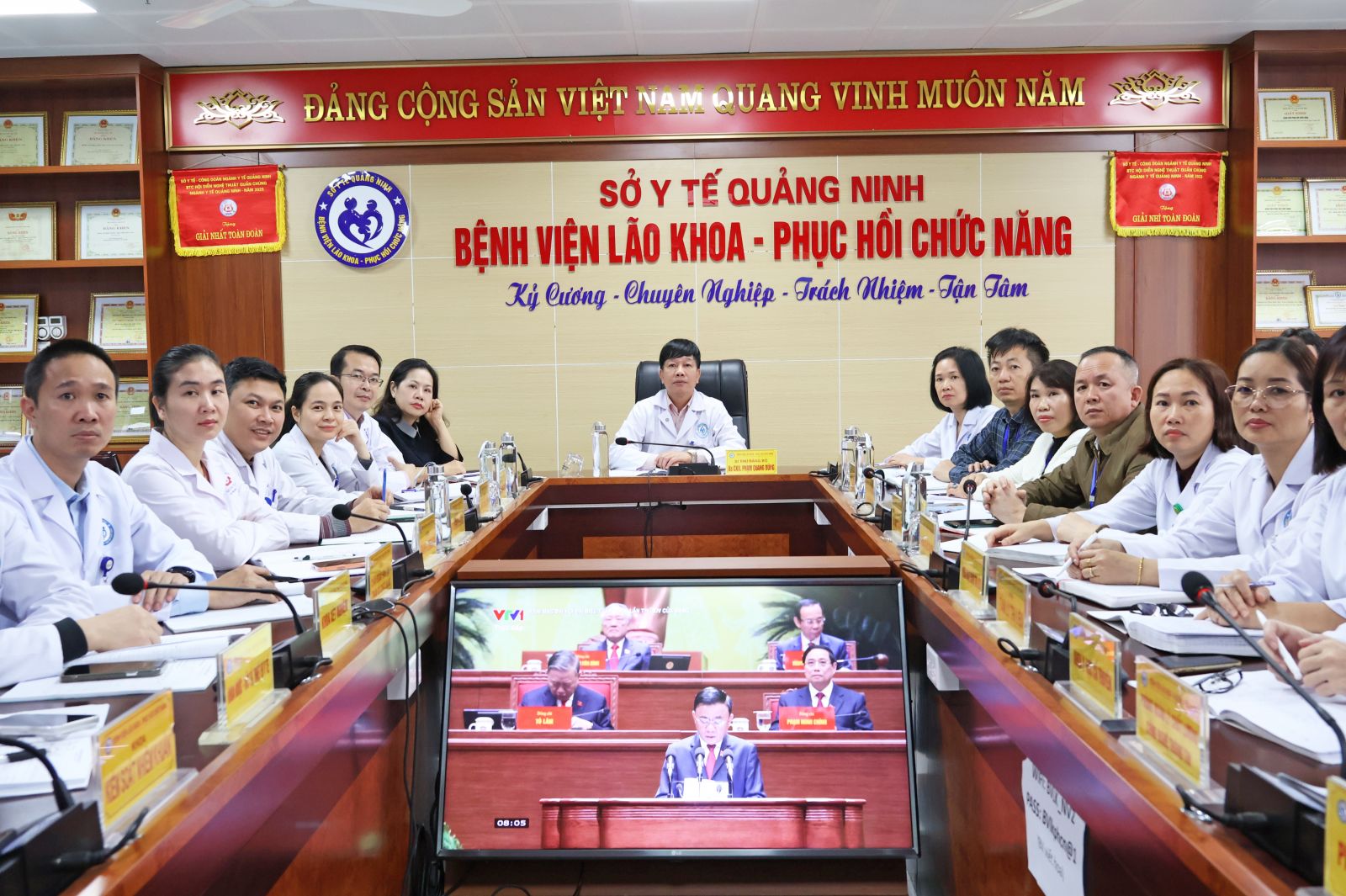 Sáng ngày 20/01/2026, cán bộ chủ chốt của Bệnh viện Lão khoa - Phục hồi chức năng tập trung tại Hội trường Bệnh viện để theo dõi truyền hình trực tiếp Lễ Khai mạc và các nội dung quan trọng của Đại hội đại biểu toàn quốc lần thứ XIV của Đảng. Việc theo dõi, nghiên cứu các văn kiện, phát biểu chỉ đạo tại Đại hội được xác định là nhiệm vụ chính trị quan trọng, góp phần giúp đội ngũ cán bộ lãnh đạo, quản lý kịp thời nắm bắt những định hướng lớn, tư duy mới, tầm nhìn chiến lược của Đảng, làm cơ sở để cụ thể hóa vào chương trình hành động, kế hoạch phát triển của Bệnh viện trong thời gian tới.