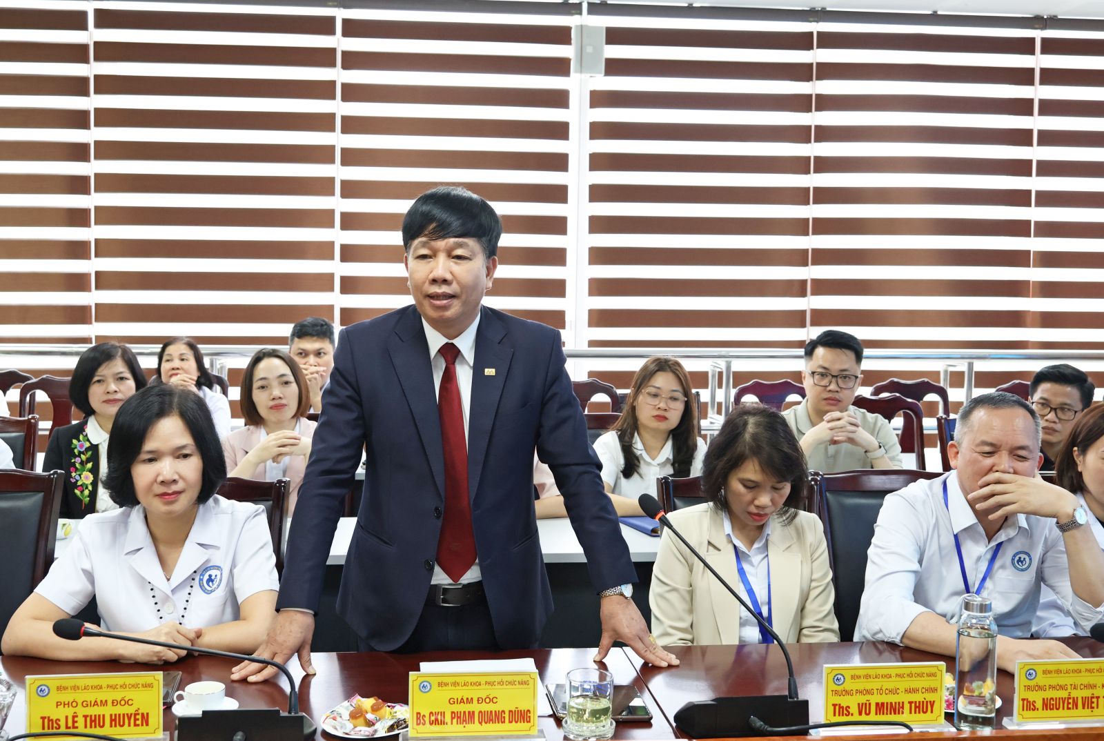 Đoàn công tác do ThS.BSCKII Nguyễn Thị Minh Hải - Giám đốc Bệnh viện làm Trưởng đoàn; cùng BSCKII Nguyễn Thị Việt Hà - Phó Giám đốc Bệnh viện và các cán bộ chủ chốt. Đón tiếp và làm việc với đoàn có TTUT, BSCKII Phạm Quang Dũng - Giám đốc Bệnh viện; TTUT, ThS.BS Lê Thu Huyền - Phó Giám đốc Bệnh viện; cùng trưởng, phó các khoa, phòng.