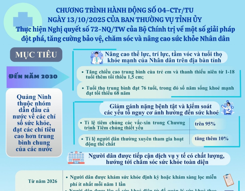 INFOGRAPHIC: Chương trình hành động số 04-CTr/TU thực hiện Nghị quyết số 72-NQ/TW của Bộ Chính trị về một số giải pháp đột phá, tăng cường bảo vệ, chăm sóc và nâng cao sức khỏe Nhân dân