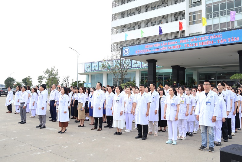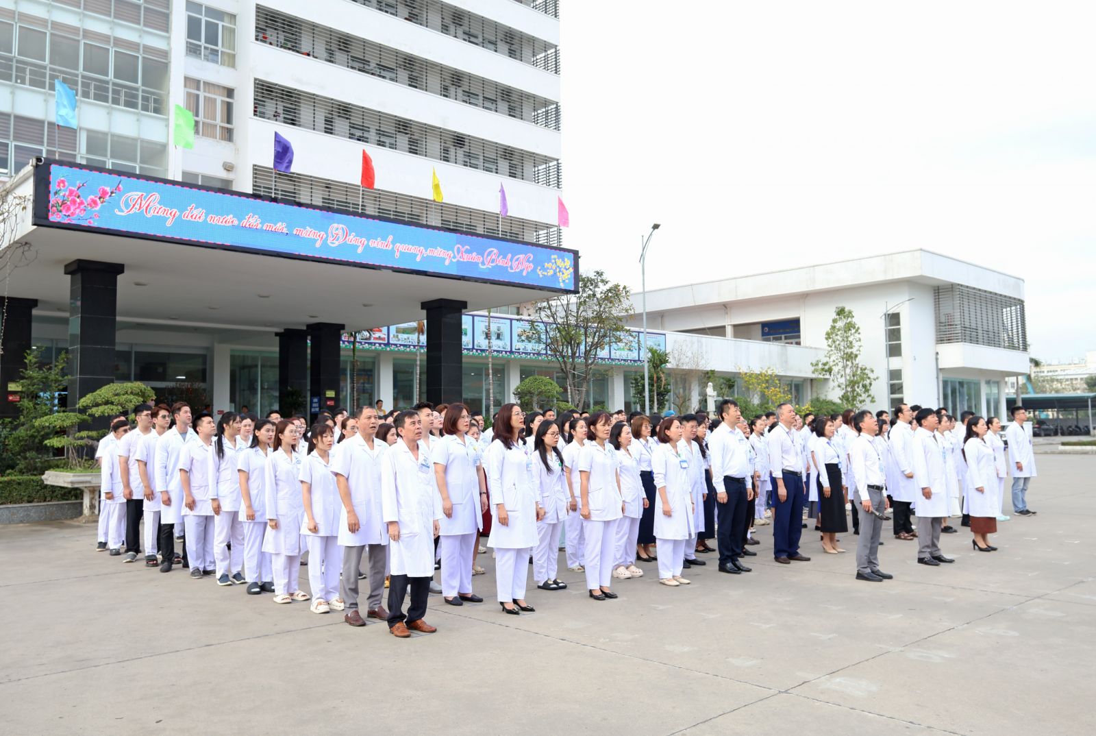 Dưới cờ đỏ sao vàng thiêng liêng, toàn thể cán bộ, đảng viên, viên chức, người lao động Bệnh viện đứng nghiêm trang, hướng về lá cờ Tổ quốc và đồng thanh cất cao tiếng hát Quốc ca. Không khí buổi lễ diễn ra trang nghiêm, thể hiện tinh thần đoàn kết, niềm tự hào dân tộc và ý thức trách nhiệm chính trị của đội ngũ cán bộ y tế đối với sự kiện trọng đại của đất nước.