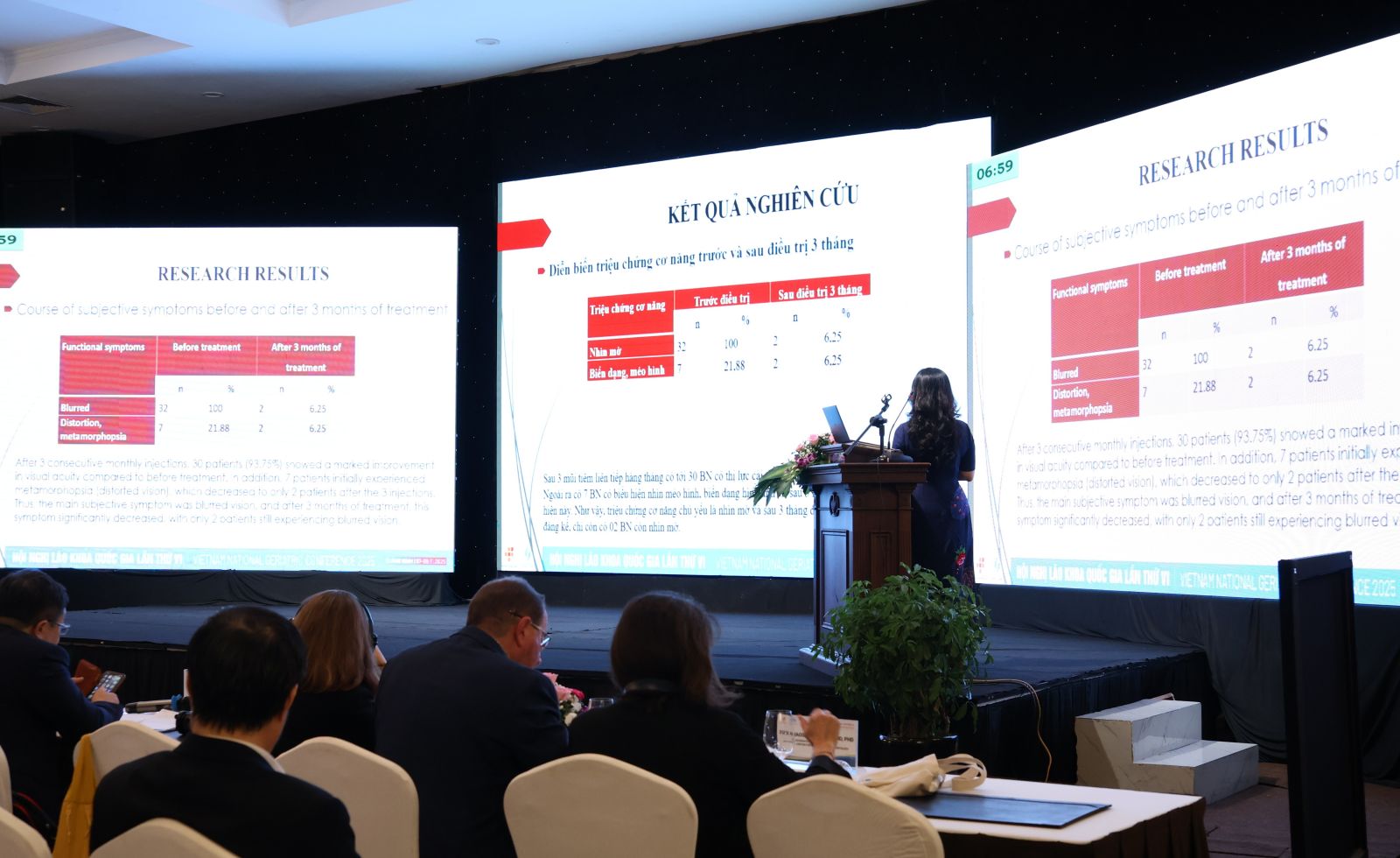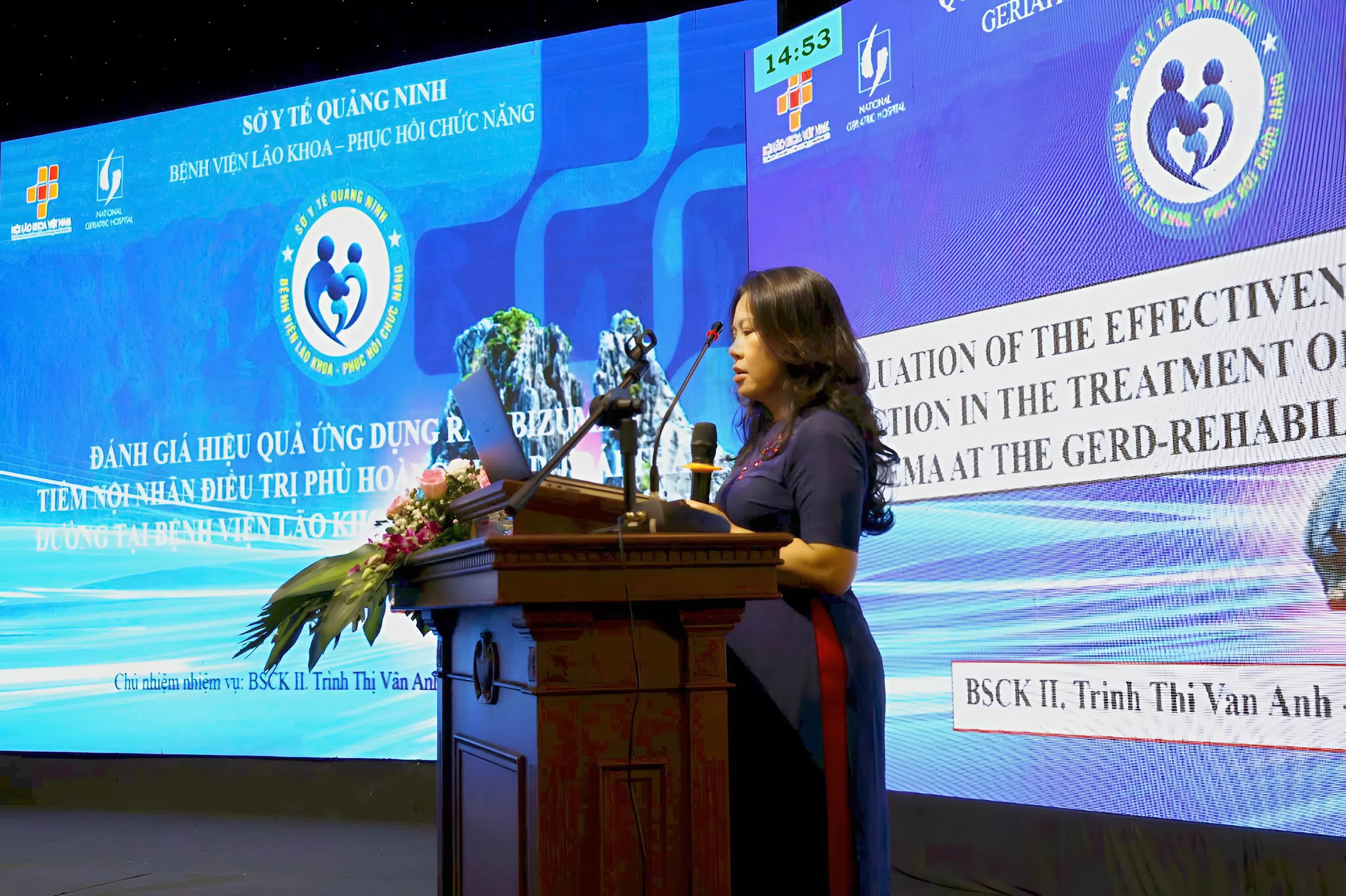 Trong phiên báo cáo chính, BSCKII Trình Thị Vân Anh - Phó Giám đốc Bệnh viện Lão khoa - Phục hồi chức năng (Quảng Ninh) đã đại diện đơn vị trình bày công trình: “Đánh giá hiệu quả ứng dụng Ranibizumab tiêm nội nhãn điều trị phù hoàng điểm do đái tháo đường.”